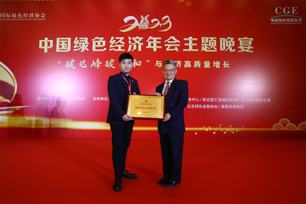 圖2 國際綠色經濟協會名譽主席沙祖康向新至雙碳授予綠協標準建設專委會牌匾